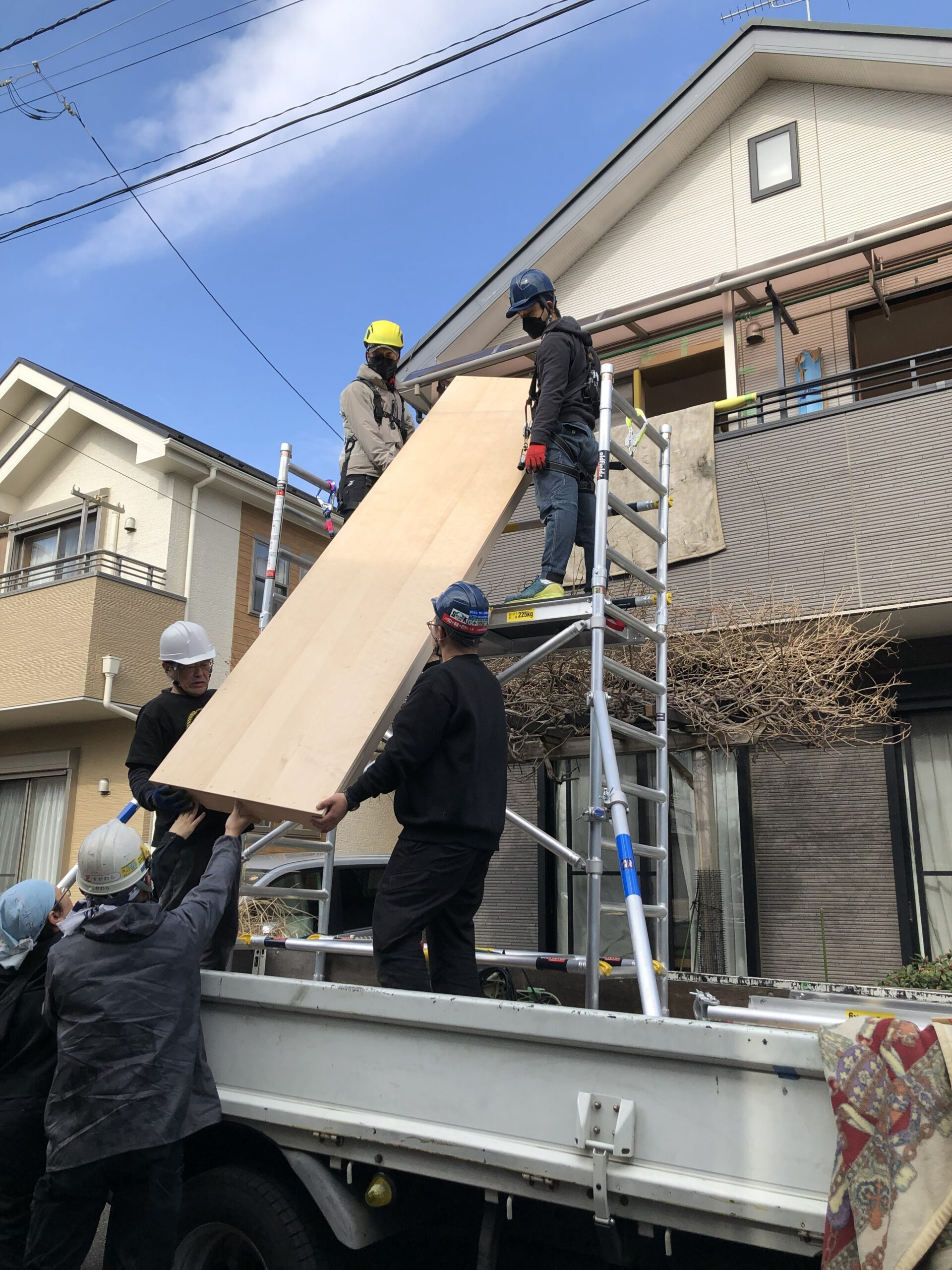 写真は、運び込む作業の様子です。お稽古場が2階ですので、およそ3m×74cmもの台は、普通の住宅の階段では運ぶのが困難で、どのように2階に上げるかが課題でした。トラックに、鳶の方が乗れる足場を組み立て、職人さん達がリレーで窓までかつぎ上げて、2階の部屋に入れるという方法で行いました。