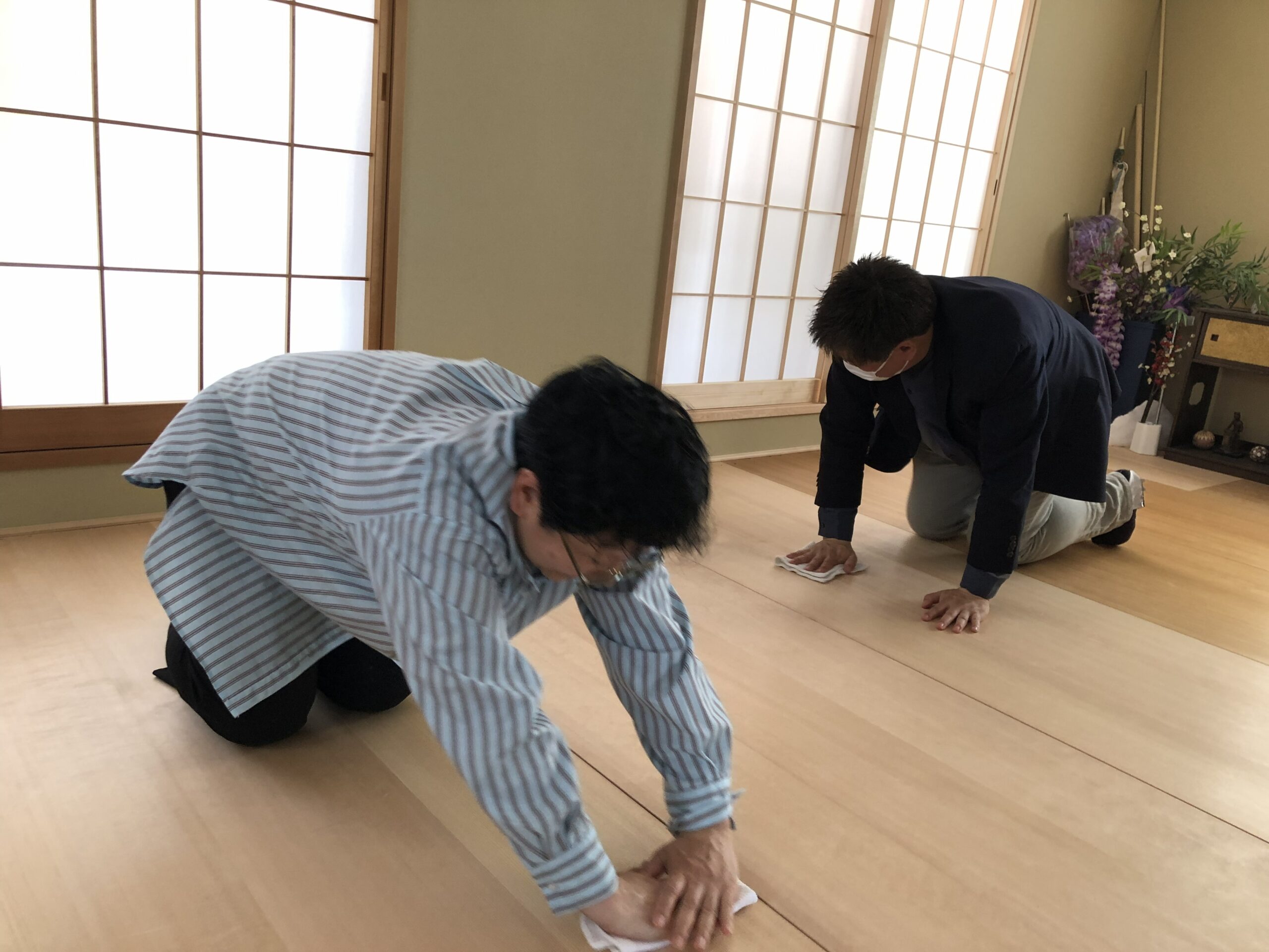 所作台が完成した後、井手口のスタッフさんは、所作台を木綿のぞうきんでカラ拭きされます。それはどこの劇場においても、そうされるそうです。天然の木材には、木綿のカラ拭きが一番良いからなのだそうです。様々なホコリが舞う現代、得てして化学ぞうきんを使ったり、水拭きをしたりしてしまいがちですが、お掃除の原点を再確認した思いでした。